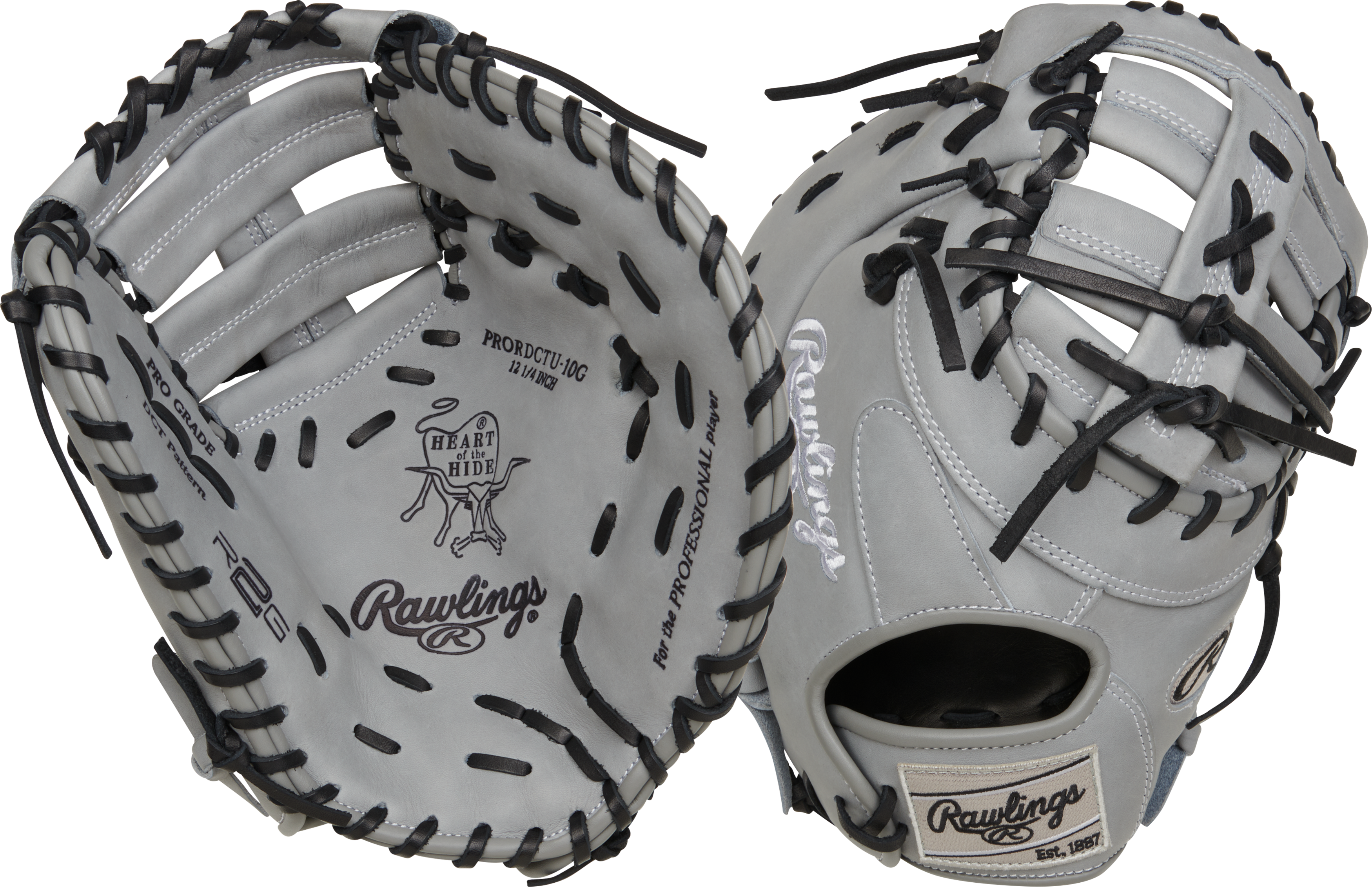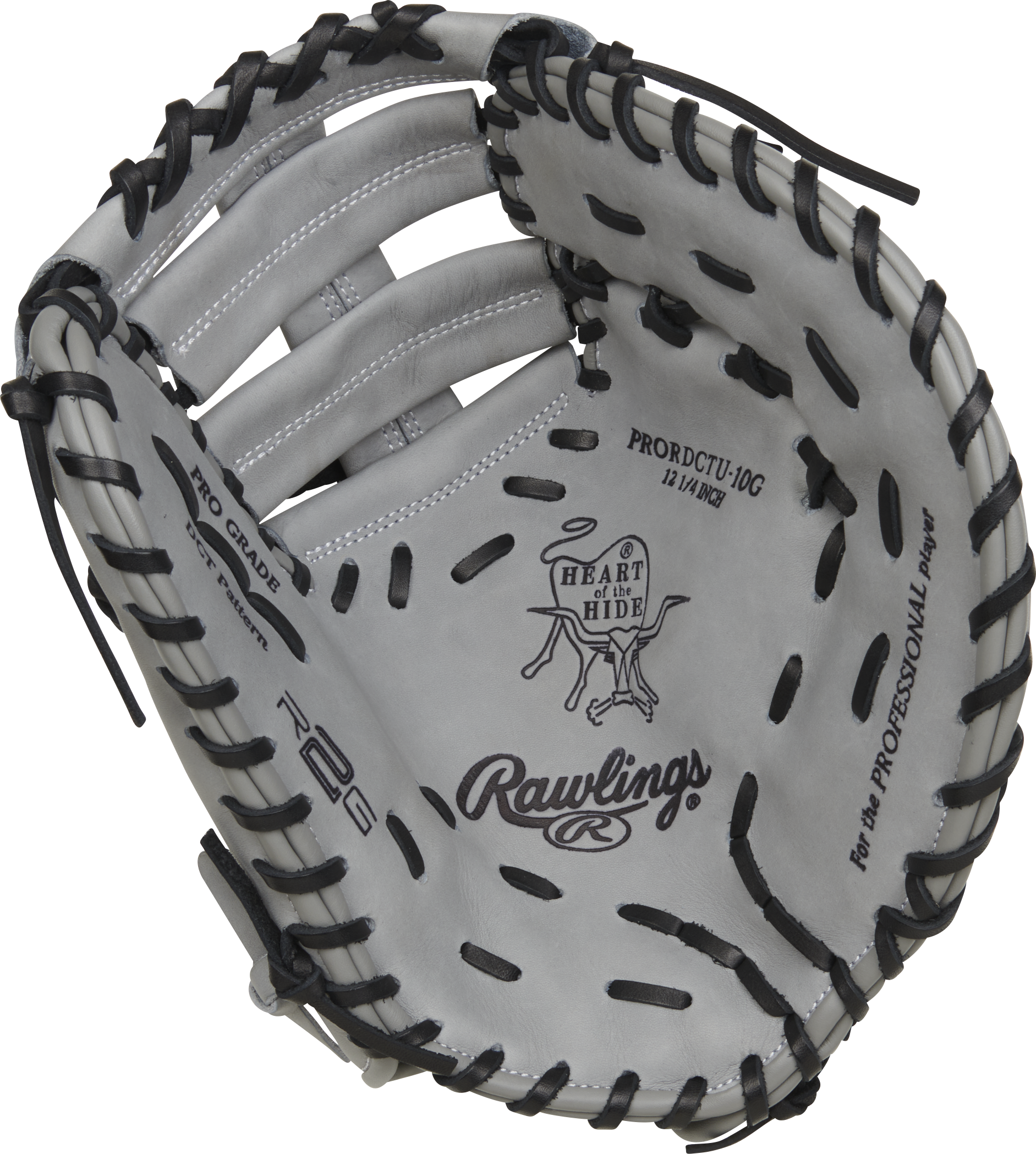 First base is where games are won and lost — and the Rawlings Heart of the Hide 12 1/4" First Base Mitt (PRORDCTU-10G) is built to make sure every play ends in your favor. Finished in a clean, all-gray leather with black laces and a classic white-on-gray Rawlings Est. 1887 patch, this mitt has an understated, serious look that matches the way a great first baseman approaches every rep. The DCTU pattern delivers a deep, wide pocket that swallows short hops, stretches on tough picks, and gives you the confidence to come off the bag and attack anything thrown your way. Built from ultra-premium top grade U.S. steer hide leather pulled exclusively from pro-grade hides, and featuring ContoUR fit with R2G factory break-in, this is the first base mitt for the adolescent and teenage player who wants to anchor the infield at the highest level.
