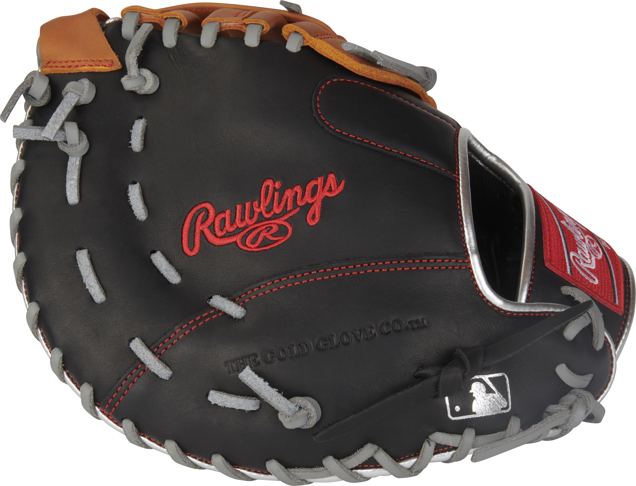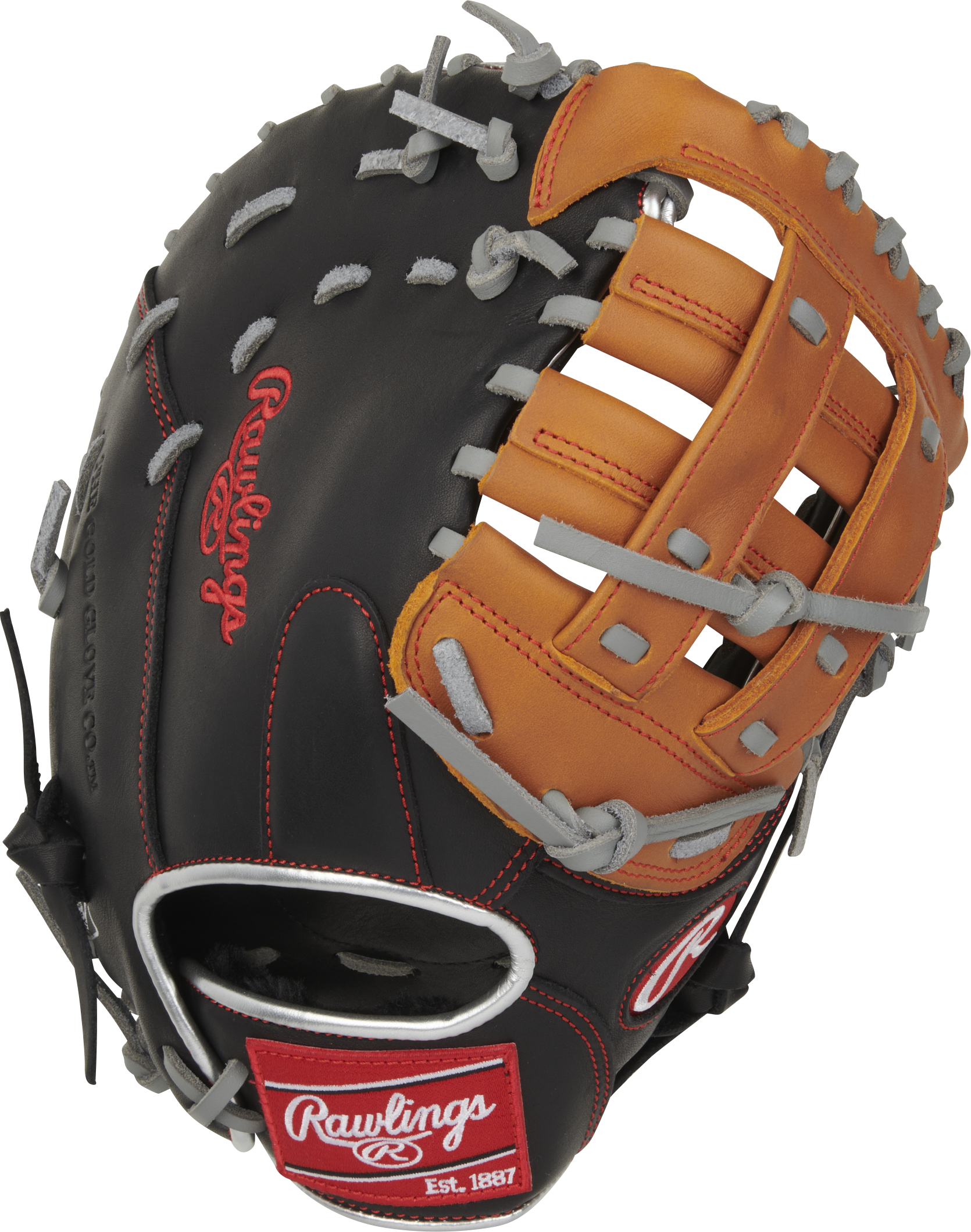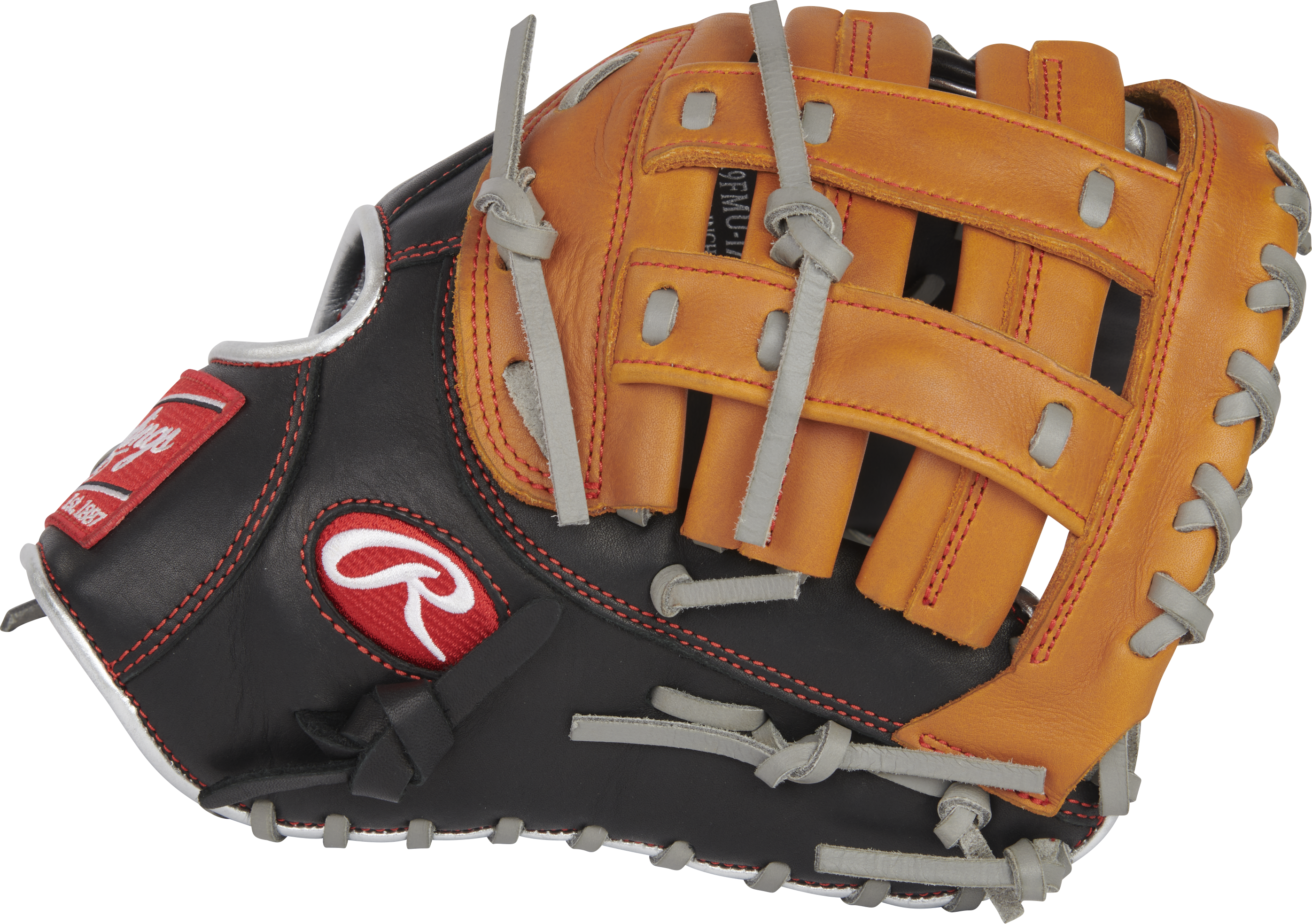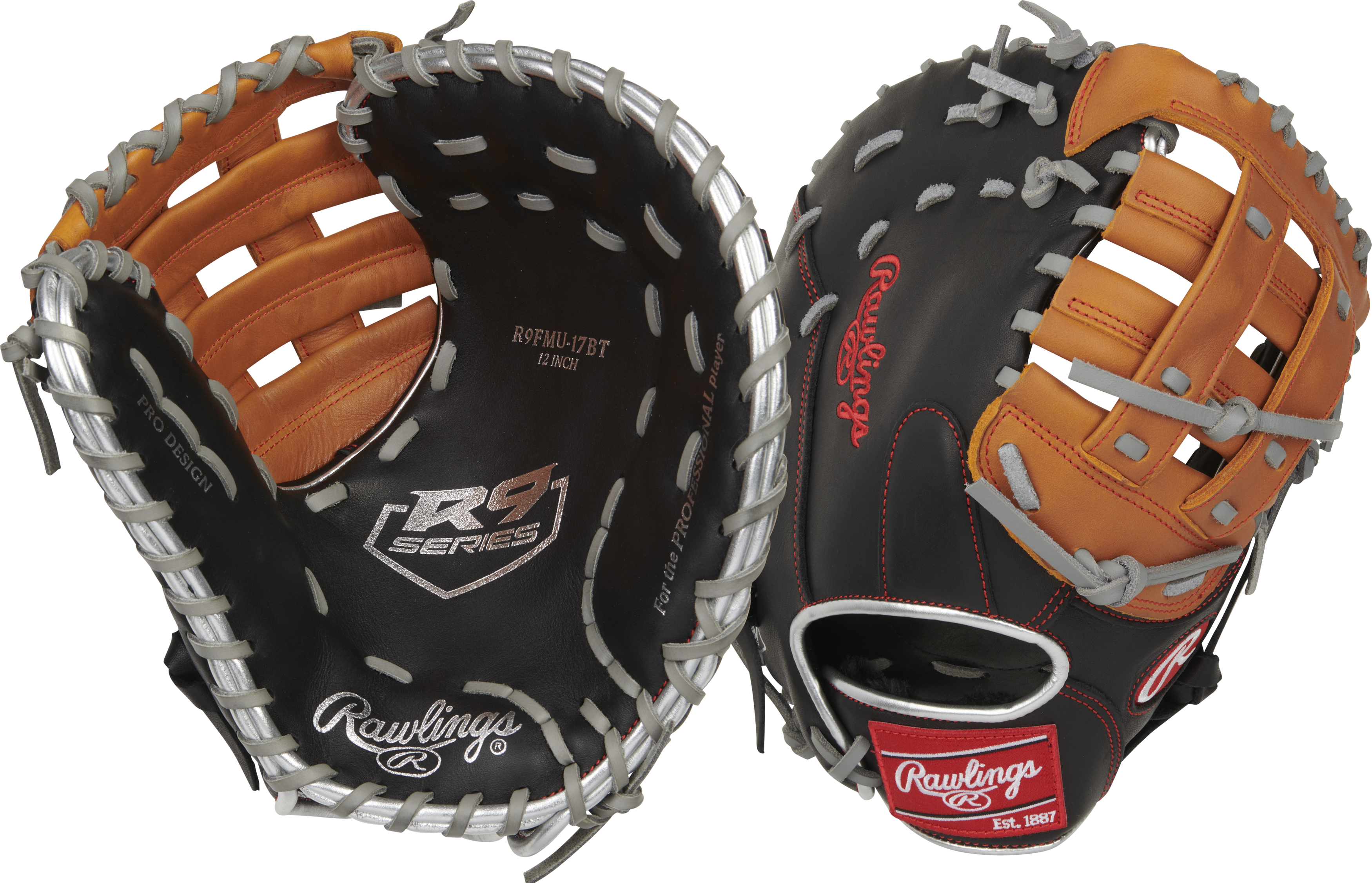 First base is only as good as the mitt on your hand — and the Rawlings R9 ContoUR 12" First Base Mitt (R9FMU-17BT) makes sure young players have everything they need to anchor the infield with confidence. The ContoUR fit is built from the ground up for youth players with smaller hands, featuring narrow and lowered finger stalls, a smaller wrist opening, and an adjustable pull-lace strap so the mitt wraps snugly around your player's hand from day one. The bold black and tan colorway with gray laces and red Rawlings script gives it a sharp, serious look that any young first baseman will be proud to flash at the bag. With a soft all-leather shell, Modified Pro H-Web, and 80% factory break-in, this mitt is practically game-ready right out of the box — and because it's built on pro-style patterns, every fundamental your player develops now will carry forward seamlessly to adult models when the time comes.