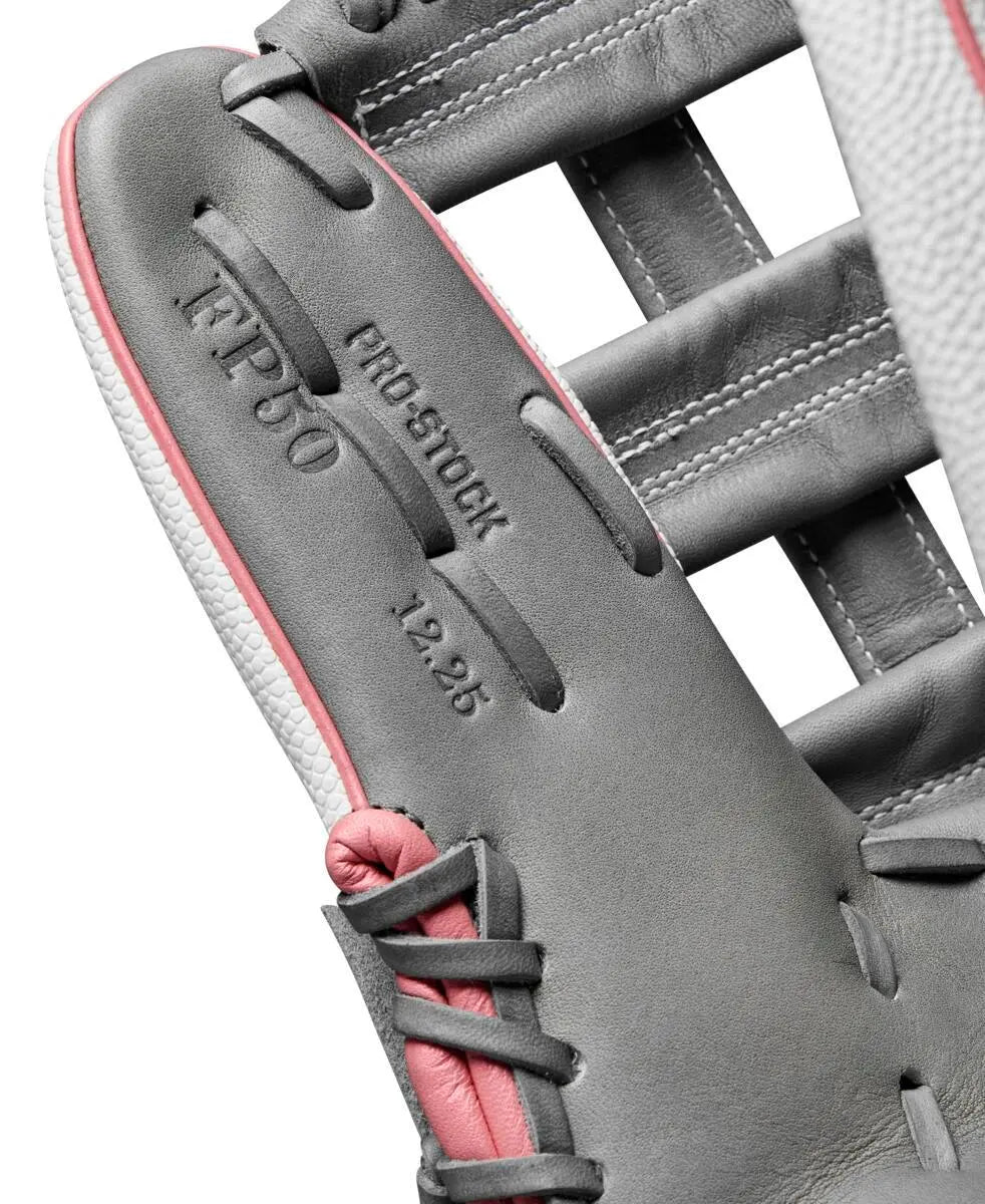 The 12.25” size is ideal for outfielders who want precision without sacrificing durability. The glove features a sturdy Dual Post Web that helps maintain its shape through tough plays, while Metallic Rose Gold accents give it a stylish edge on the field. Constructed with Pro Stock® Leather, this glove is known for its rugged durability and unmatched feel. The inclusion of SuperSkin™ — a microfiber material that is half the weight of leather but twice as durable — ensures that the glove remains resilient and easy to maintain.