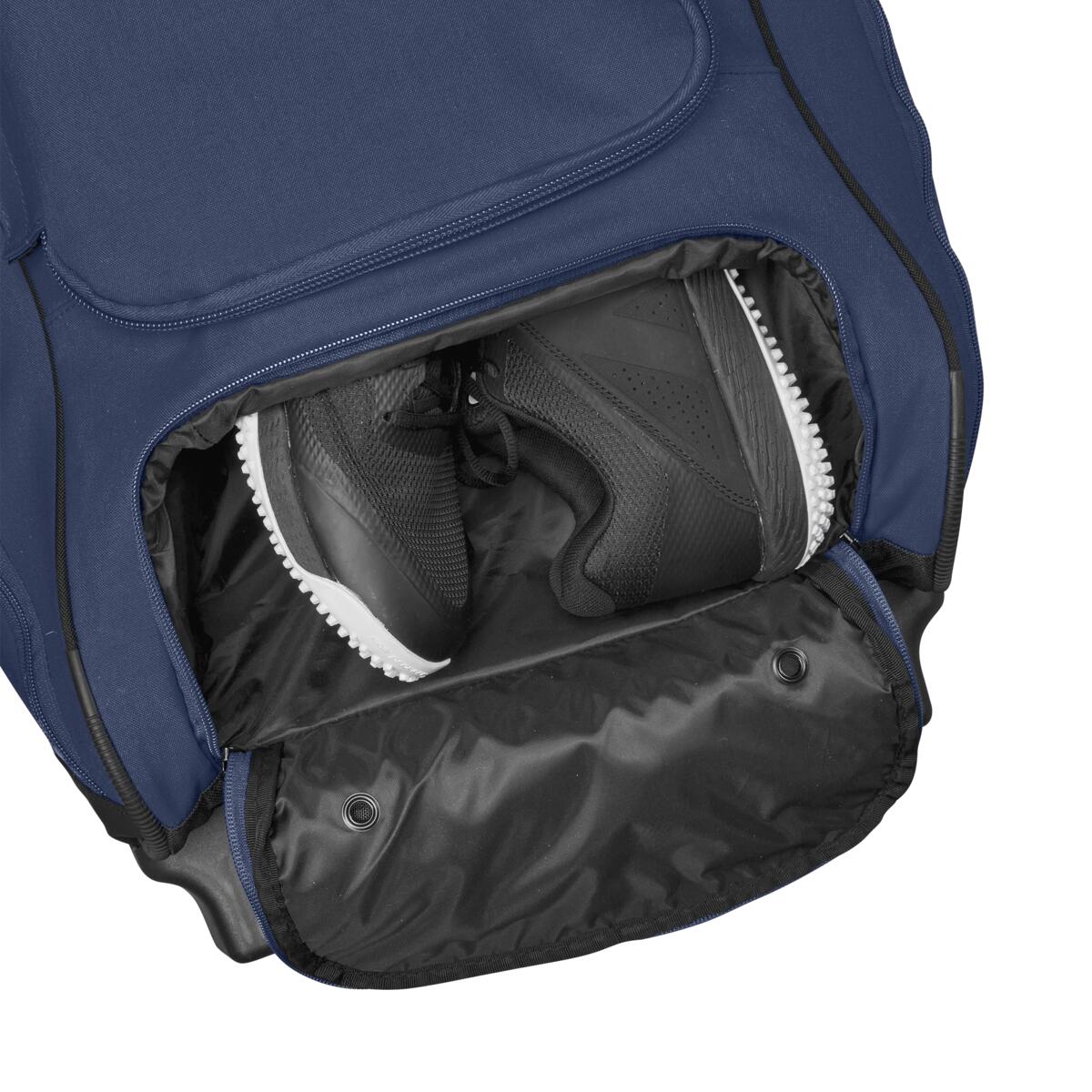 The EvoShield Stonewall 2.0 Baseball/Softball Catcher's Bat/Equipment Bag is built to withstand the rigors of the game while providing maximum organization and durability. Designed with a large main compartment, this bag offers ample space to store your catcher’s gear, bats, and accessories. The high-rise wheel chassis ensures smooth transportation on and off the field, while the separated shoe compartment keeps dirt and odors contained.