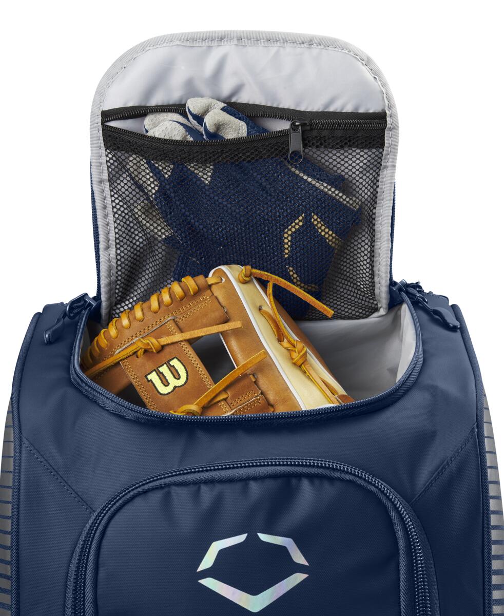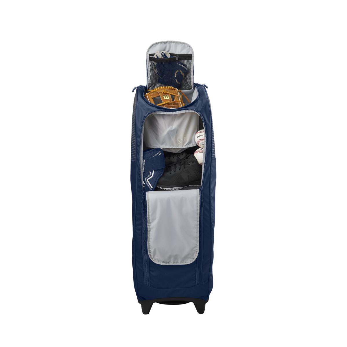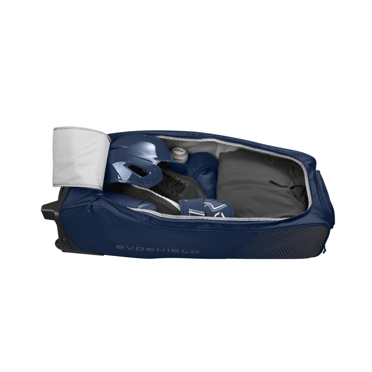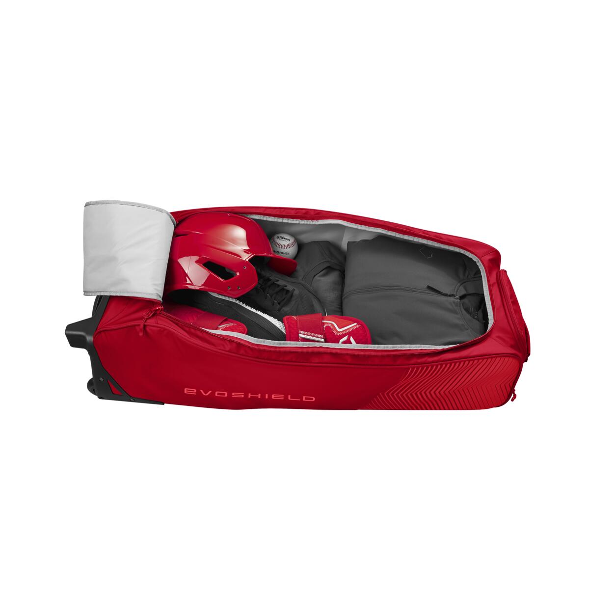 The Evoshield Tone Set Wheeled Bag WB57303 is designed to keep your equipment under control with all the space required for equipment you need at practices or games, featuring a high-rise wheel chassis with rugged molded wheels that make it easy to traverse any terrain with a bag filled with heavy gear. This highly-functional wheeled equipment bag combines water-resistant shell fabric construction with comprehensive storage solutions to ensure your baseball and softball gear stays organized, protected, and easily accessible whether you're heading to practice sessions, competitive games, or tournament play throughout your season.