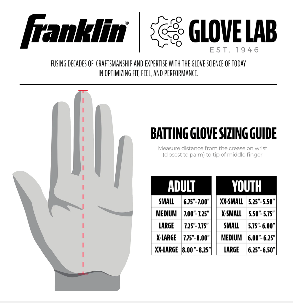 Step up to the plate and showcase your patriotic pride with the Franklin MLB 4th of July CFX Adult Baseball/Softball Batting Gloves. These limited-edition gloves combine functionality and style, featuring a traditional red, white, and blue colorway along with a brushed American flag logo. Designed with Floating Thumb Technology, these gloves offer increased flexibility and adaptability for a superior fit. The Dual-Layered Lycra-Flex Bridge provides lightweight flexibility across the knuckle back and side-flex areas, ensuring optimal comfort during every swing. The Tectonic Fit Inserts allow the glove to flex without adding bulk to the back of the hand, giving you better movement while at the plate. Crafted from PITTARDS DIGITAL sheepskin leather, the palm maintains softness and tactility in all weather conditions, offering a superior grip. The Quad-Flex Creasing minimizes material buildup between your hand and the bat handle for a seamless, smooth feel. Whether you're playing baseball or softball, these batting gloves will help you stand out with pride and performance on the field.