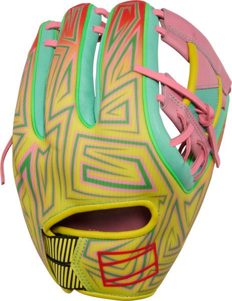 Make a bold statement on the diamond with the Rawlings REV1X 11 1/2" Infield Baseball Glove REV204-2XPG from SPC Sports. This eye-catching infield glove showcases a vibrant geometric pattern in electric yellow, green, and pink that commands attention while delivering elite-level performance. Engineered with Rawlings' advanced REV1X technology and premium construction, this glove provides the precision handling and lightning-fast response that serious infielders demand for peak competitive play.